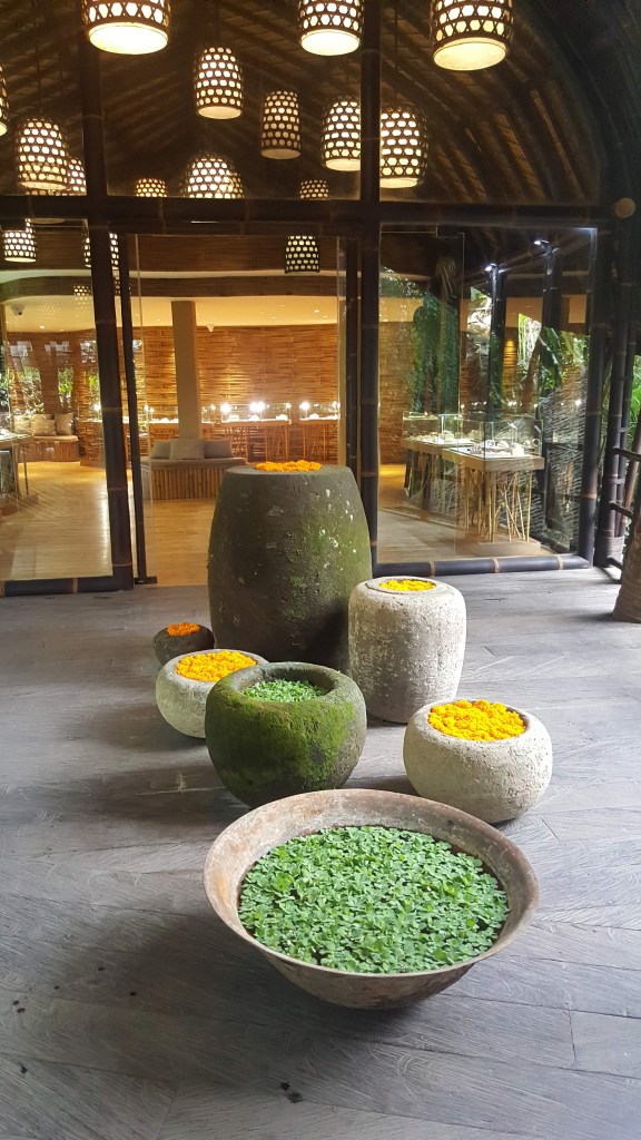 My $2 million massage was at the Spa in the eco chic wellness resort called Five Elements. It is nestled among (rice) paddy fields and took over an hour to get there from our hotel. The treatment room is open to a river roaring merrily in the background.