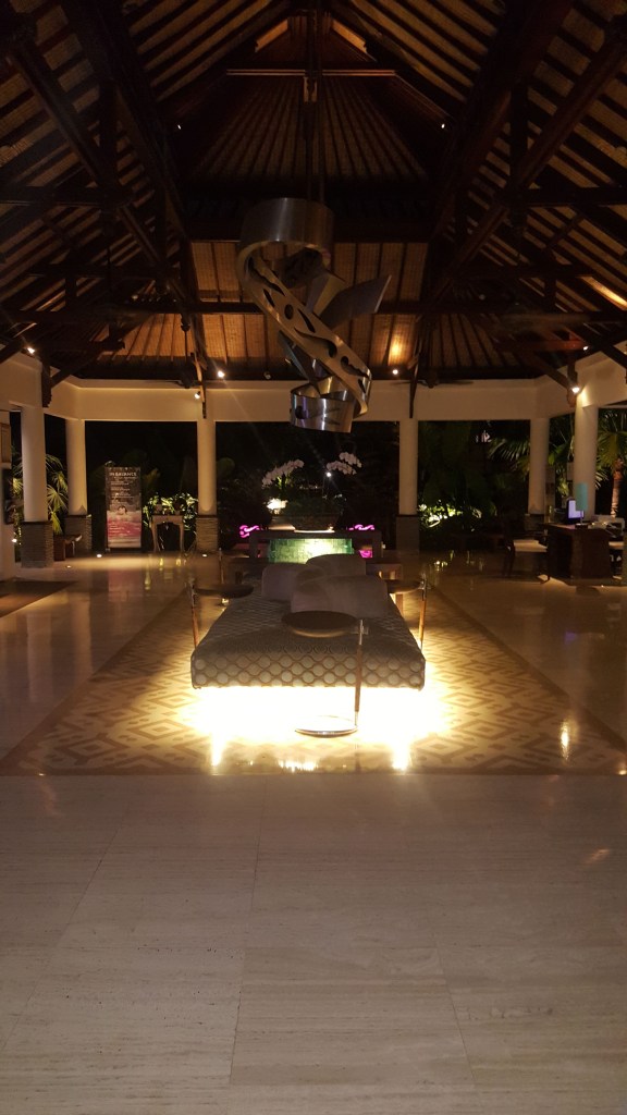 We say a few prayers in Immigration because one of my brothers-in-law gets pulled into the little room for his passport while my suitcase is MIA. Finally, we clear customs and head to the Novotel Bali Ngurah Rai Airport hotel for a night. Our actual hotel wouldn’t be ready for the first night, so that’s why we booked the airport hotel. We follow some dusty signs up a ramp that says, “Airport Hotel”. There is nothing but tumbleweed on this extremely dark ramp and my sister goes, “are we going the right way?” But we fearlessly press on and end up on a dark lonely rooftop. Fortunately, we discover it is the back of the hotel! But life is all about perspective because, the next morning, we see the amazing rooftop view of the hotel which, by the way, is quiet, pretty and clean! So clean, that there was a sign under the bed that said “yes we have cleaned under here too!”