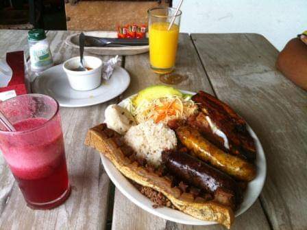 We also tried their typical dish bandeja paisa which includes beans, rice, ground meat or carne asada, chorizo, fried egg, arepa, and chicharrón. Be warned…it is all fried!