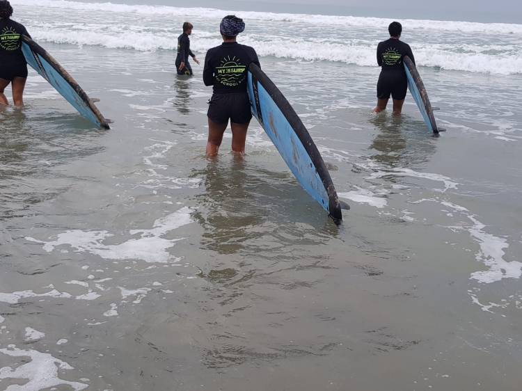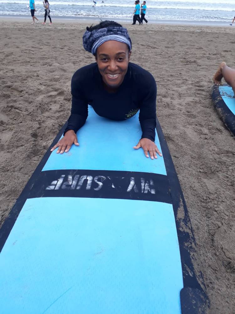 I was like “yea”, our friend was like “yea”, my sisters were like “yea”. Then we saw the sea and everyone went quiet. I thought to myself, whose bright idea was this? My friend asked a guide, “any thing lives in that water?” You see, we weren’t surfing the crystal clear waters of Seven Mile Beach. Nooo…this one had a slightly murky hue and I honestly couldn’t tell you if there was sand on the bottom. Our guide snickered and gave us some wet-suit tops to put on.