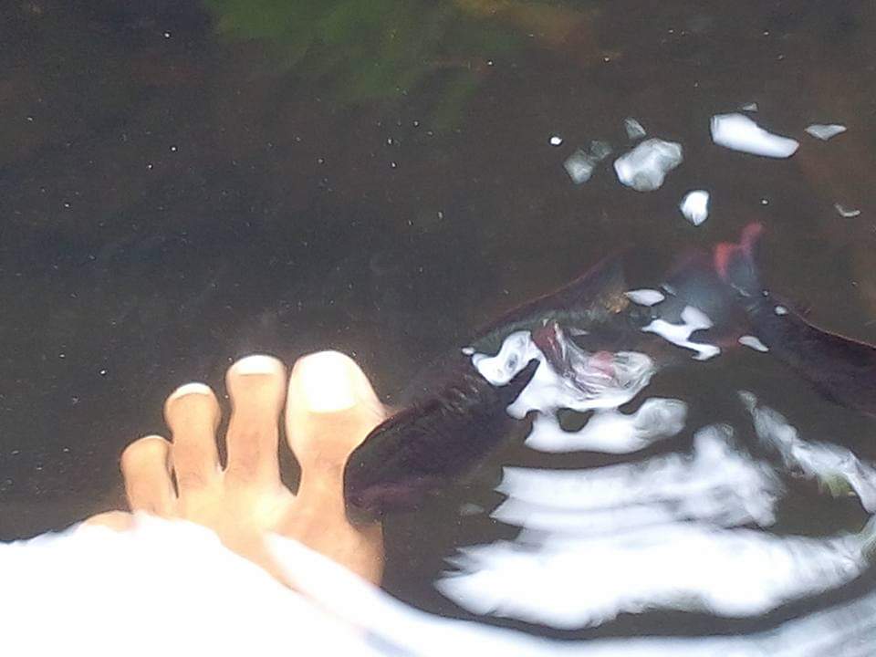 We proceeded to gingerly put our feet in. The water was cold but then I understood the squealing when some fish attached themselves to my toes and heels. It was the weirdest sensation but when the shock wore off, I started to speak to the fish. There was a little fat one who liked my heels which was good because they are supposed to be eating the dead skin off your feet. I encouraged the fish to make sure they got every bit of dead skin off! After all, I was paying for this service LOL.