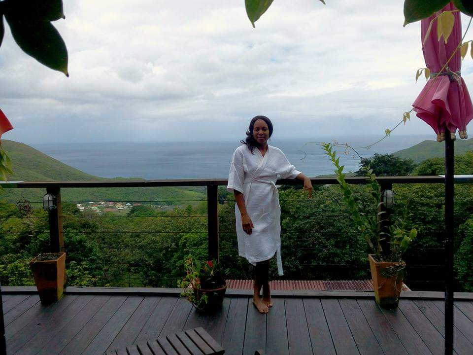 As part of a pre-birthday trip to Guadeloupe, my family and I booked the fish pedicure at the Tendacayou Spa. We took the drive up a precarious mountainside where I prayed the car all the way up but the reward when we arrived at the spa, was a gorgeous view all the way to the ocean. We donned our robes with no clue what to expect. Imagine our surprise when they led us to a pond where other people were dangling their feet into the water and squealing at moments. There was one man in particular whose squealing made me chuckle!